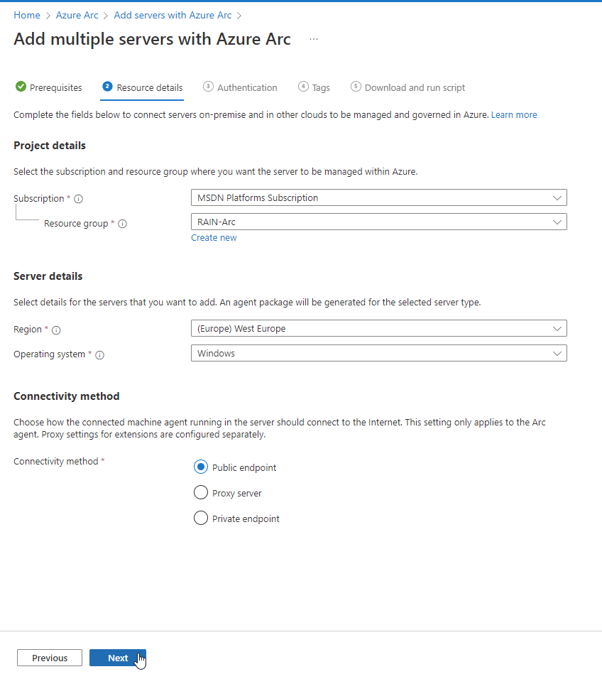 Return back to the deployment by clicking on “Add Multiple servers with Azure Arc” on top and then on Resource Detail before clicking again on next and now you can select the service principal: